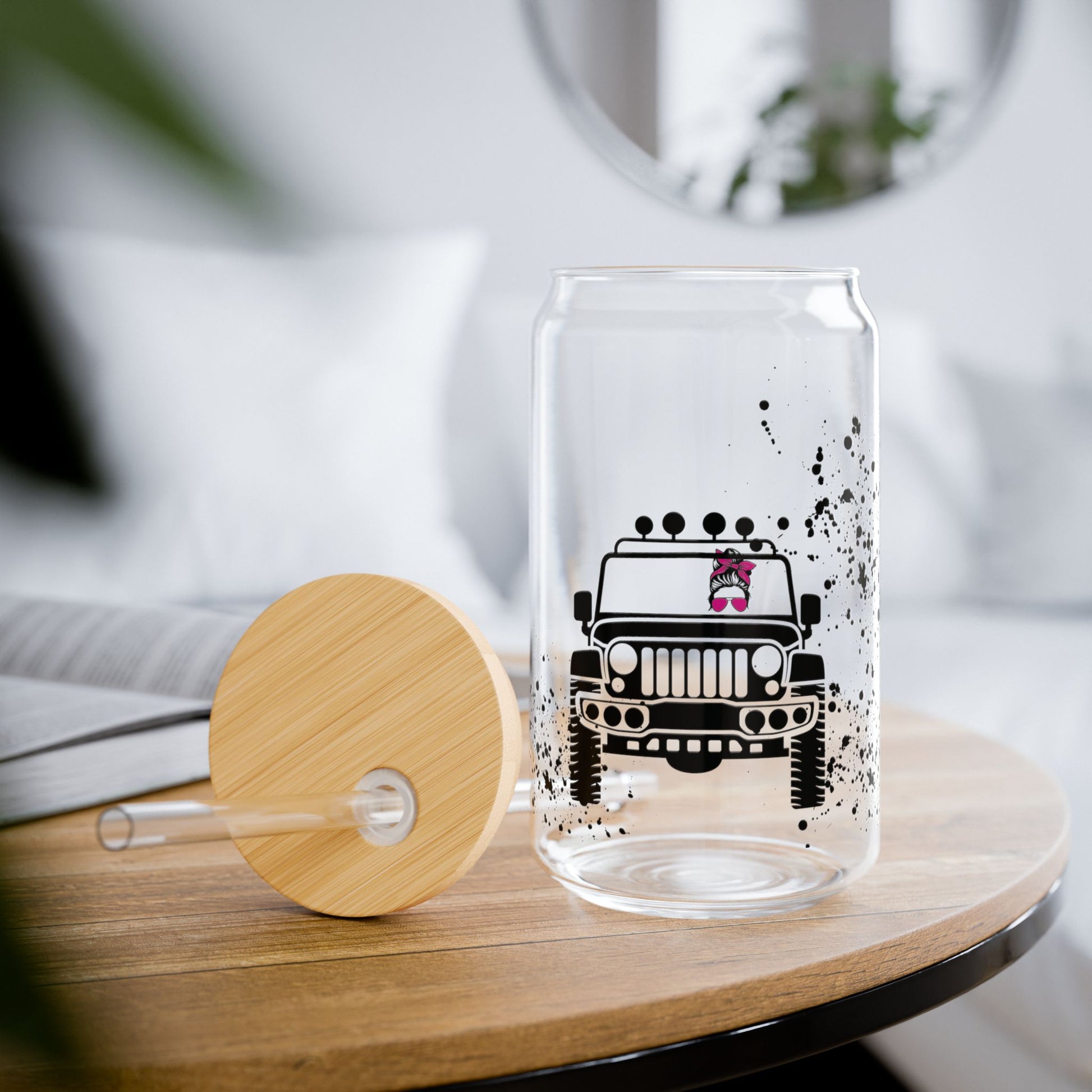 Off Road Girl Pink Hair Band 16oz Glass Can with Lid and Straw